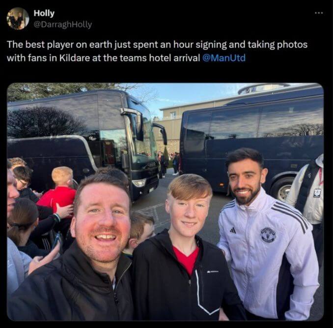 Trong đợt tập huấn tại Kildare, Bruno Fernandes đã có hành động rất thân thiện với người hâm mộ. Anh dành trọn một giờ trước khách sạn nơi đội đóng quân để ký tặng và chụp ảnh cùng các fan.