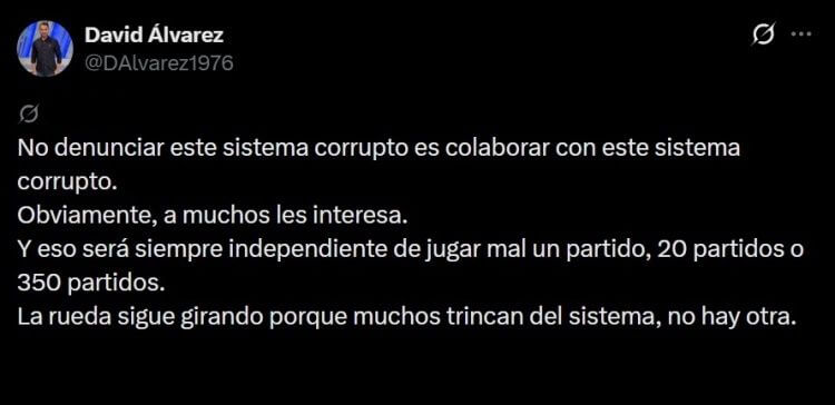Ngày 11/4, sau trận hòa 1-1 giữa Real Madrid và Girona, MC của Real Madrid TV, David Álvarez, đã lên tiếng trên mạng xã hội, bày tỏ sự bất mãn với các quyết định trọng tài. Anh viết: “Nếu không tố cáo hệ thống tham nhũng này thì chẳng khác nào tiếp tay cho nó, và rõ ràng điều đó lại có lợi cho rất nhiều người.”